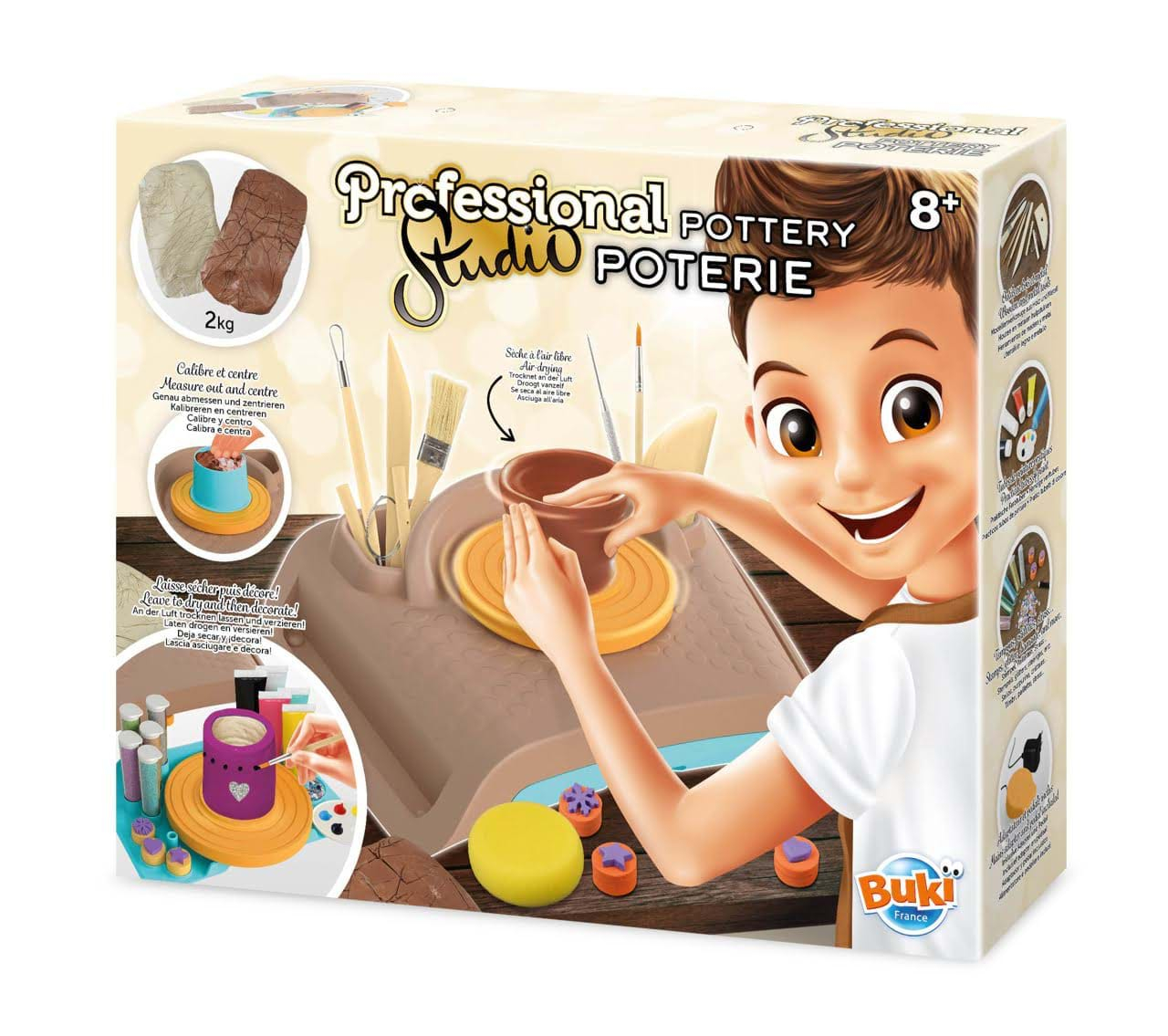 roată de olărit cu sertar, motor detașabil, pedala, adaptor priză, 2 kg lut (alb + maro), cutter, instrumente sculptură, vopsele, pensule, burete, ștampile, stylus, sclipici, strasuri, lipici, instrucțiuni