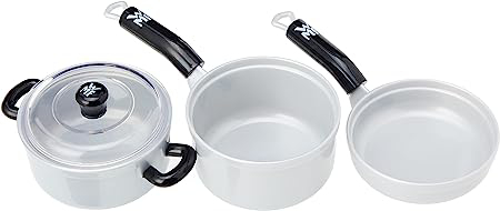 Include 3 vase de gătit (o cratiță cu capac, o oală, o tigaie)