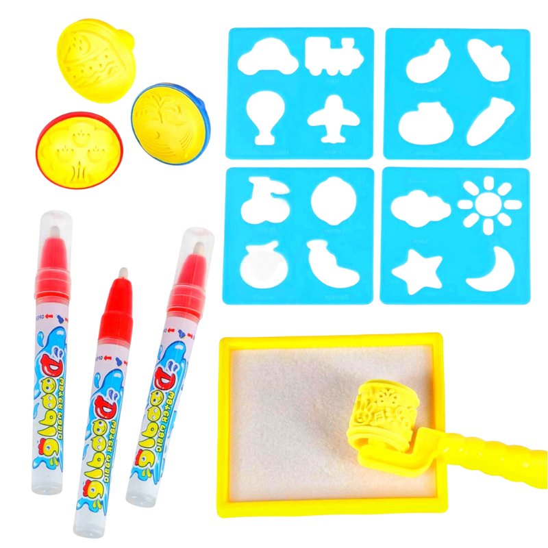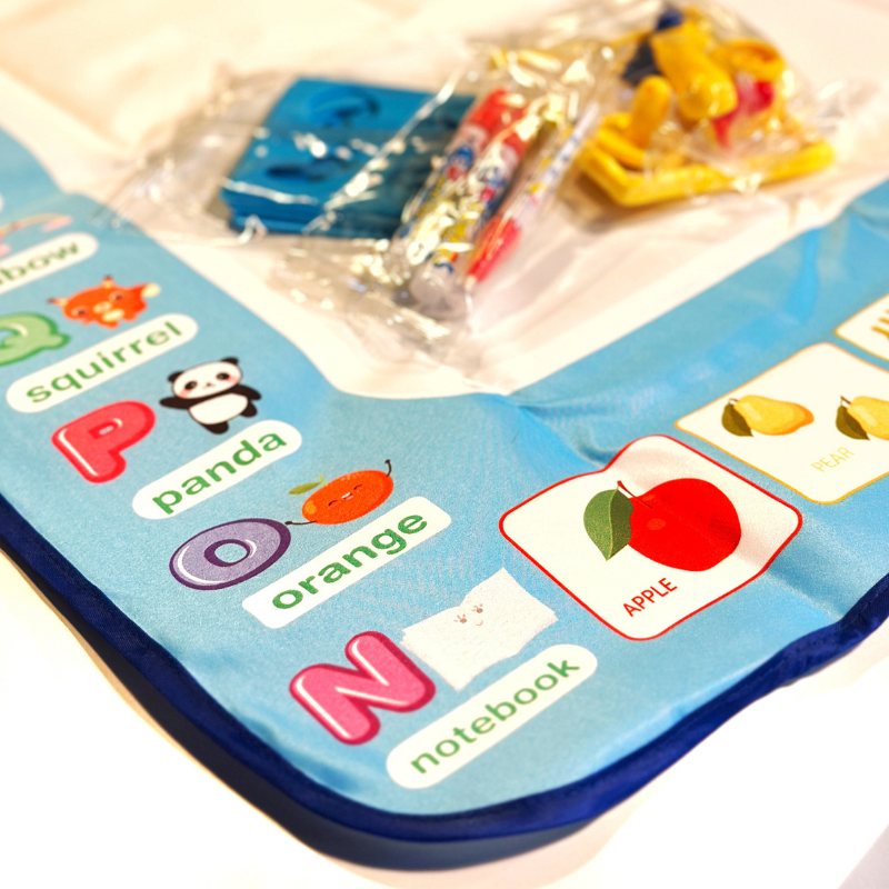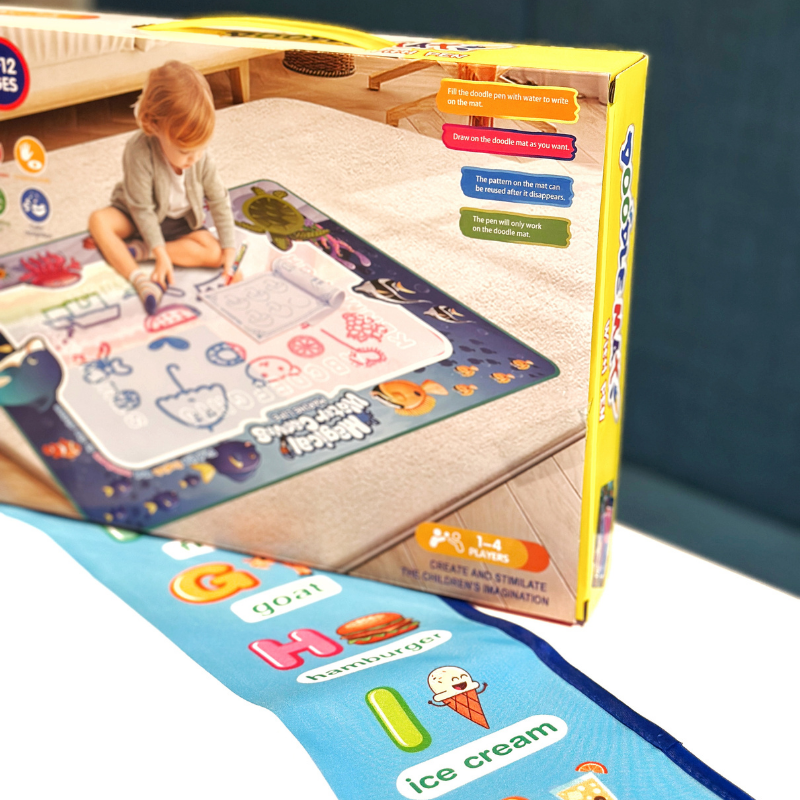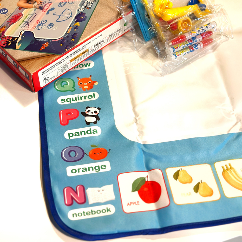 Mata de pictură cu apă pentru copii este realizată din plastic sigur și rezistent, oferind o modalitate creativă și curată de a desena. Setul include o mată reutilizabilă cu uscare rapidă, markere cu apă care nu pătează, ștampile, șabloane și un rolă decorativă. Copiii pot desena doar cu apă, fără vopsele, pete sau murdărie.
